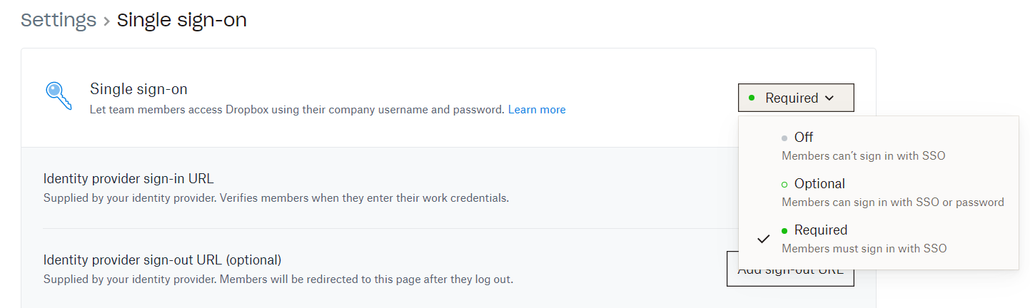 Login to your Dropbox Business Advanced admin account. Click "Admin Console" then "Settings" from the left menu. Scroll down to find "Single sign-on" and click it.